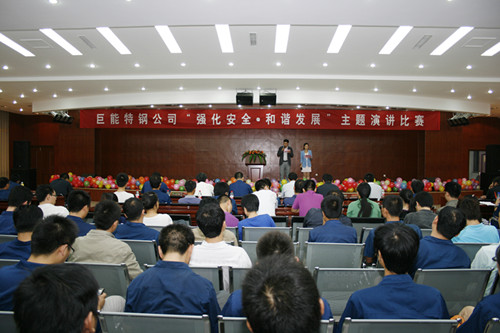 “我们特钢公司秉承“以人为本、和谐发展”的文化理念,坚持健康、稳步、持续发展,走到了辉煌的今天;爱岗敬业,努力进取,只有员工的高素质,才有产品的高品质。和谐的特钢明天会更好,衷心地祝愿我们的特钢公司取得更加骄人的业绩!今晚的“强化安全·和谐发展”演讲比赛到此结束……”在主持人响亮的谢幕声中,由办公室、生产部联合组织举办的 “强化安全,和谐发展”主题演讲比赛于8月23日晚20时40分在公司综合楼五楼大会议室圆满结束。