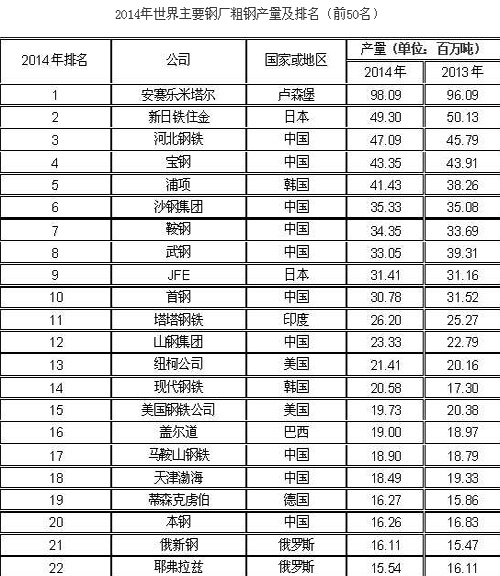 日前,国际钢协发布2014年世界主要钢厂产量和排名,我国有28家钢铁企业入围前50名,包括台湾“中钢”公司,比2013年减少1家。其中,河北钢铁集团、宝钢集团、沙钢集团、鞍钢集团、武钢集团、首钢集团6家钢铁企业入围前10。