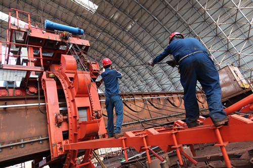 炼钢厂36m检修平台上,检修人员正在有节奏地倒拉着“葫芦链”,重达6吨的输送带像蜗牛一样缓缓向前移动。现场闷热的环境让人喘不过气来,高温丝毫没有影响他们的工作热情,熟练的动作,敏捷的身手,整个作业过程紧张而有序。“炼钢转炉输送带更换要一点点地往上吊拉,皮带两头对接齐好后再一层层进行扒皮粘接。”班长马和村腼腆说道:“这条输送带负责为1#2#转炉提供散装料,是炼钢厂的一条大动脉,我们的工作就是负责维护转炉线上输送带稳定运行。公司给我们每个工作室安装了大功率空调,工作中身体撑不住了,就轮流到里面休息会儿。”检修人员穿着工作服,佩戴安全帽、防护镜、手套、防尘口罩,脚穿劳保鞋。这样严实的一身装备,再加上四五十度的高温环境,一般人就是什么都不干,都难以忍受,而他们却每天都要在这样的环境中爬上爬下8个小时。