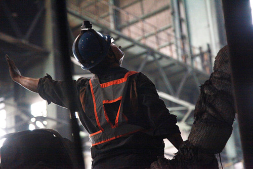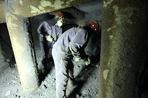 在烧结厂主抽风机房,班组成员正在对风道积灰进行清理。班组成员每两人一组进入风机内部进行清理作业,成员之间相互配合、分工明确,一个进入风机内部半蹲着身体,一边用头灯照明、一边对积灰进行清理;一个负责倒运清理下来的积灰。每组成员都干得热火朝天,全然不顾风机内的闷热,像是在比赛,唯恐被赶超。汗水浸透了衣背,但却没有人喊累。看着自己的付出换来风机内一点点被清理干净,大家疲惫的脸上露出了满意的笑容。