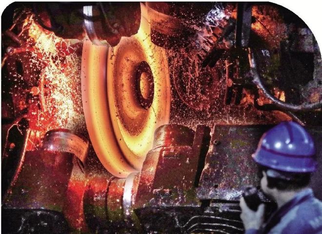 图为马钢生产的地铁车轮进入轧制工序。(王文生摄)