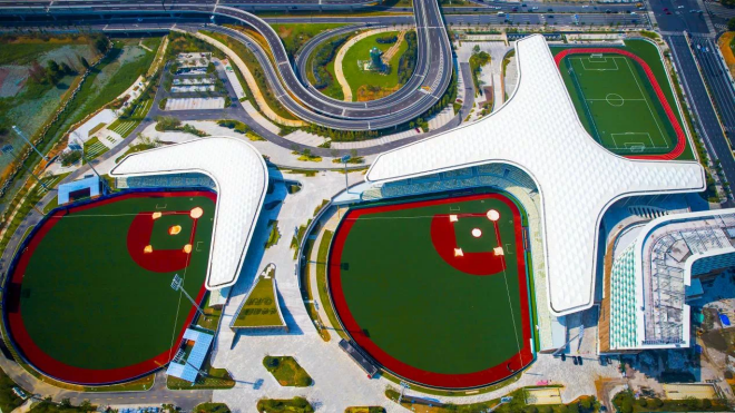 绍兴棒(垒)球体育文化中心设计以绍兴的纺织与丝带为切入点,让建筑和平台以丝带的形态将各个场馆联系起来,并与城市街道相连接,成为街道网络的一部分。同时将绸带、书卷、瓦顶等的曲线元素运用到建筑立面上,唤起民众对地域文化的集体记忆。