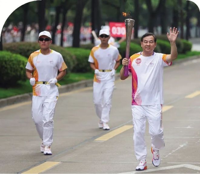 9时35分,杭钢集团党委书记、董事长张利明作为第30棒火炬手,承载着全体杭钢人的希望,从上一位火炬手手中接力点火后,向前奔跑。