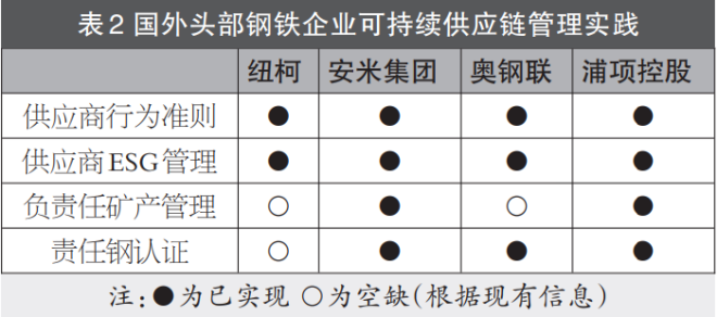 国外头部钢铁企业制订了供应商行为准则或负责任采购准则,根据准则对供应商进行评估和管理,同时采取多种举措,应对供应链风险,增强整个供应链的可持续性。