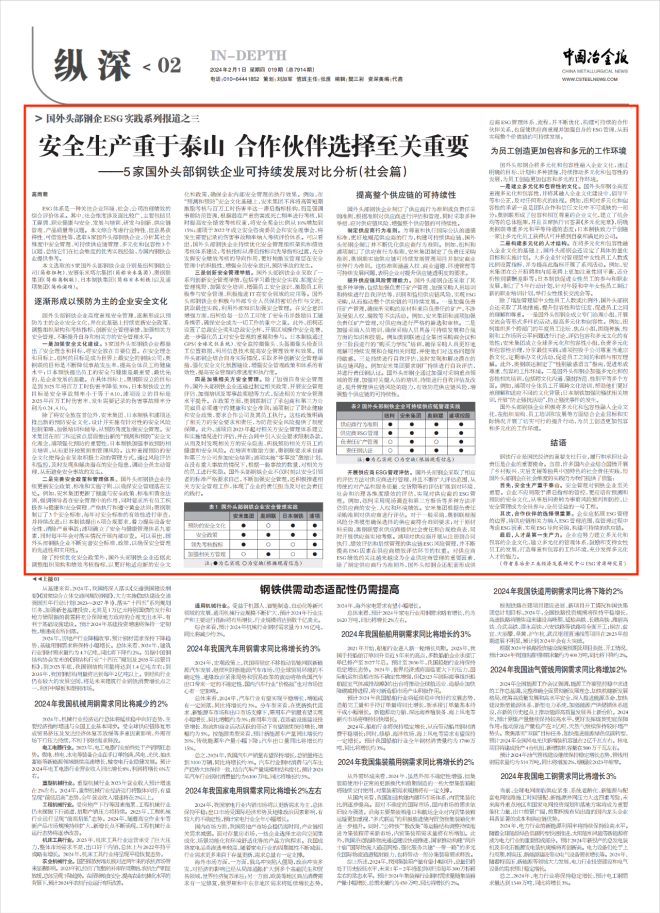 ESG体系是一种关注企业环境、社会、公司治理绩效的综合评价体系。其中,社会维度涉及面比较广,主要包括员工雇佣、职业健康与安全、发展与培训、研发与创新、供应链管理、产品质量等议题。本文综合考虑行业特性、信息易获得性、可借鉴性等,选取5家国外头部钢铁企业,分析其社会维度中安全管理、可持续供应链管理、多元化和包容性3个议题,总结它们在社会维度的优秀实践经验,为国内钢铁企业提供参考。