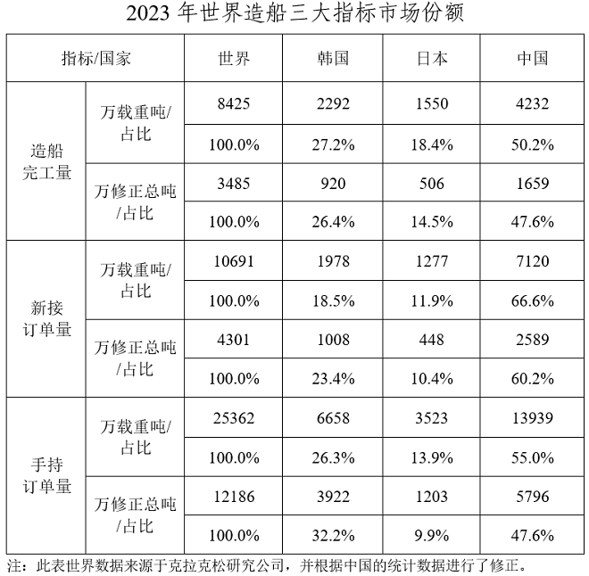 2023年,全国造船完工量4232万载重吨,同比增长11.8%;新接订单量7120万载重吨,同比增长56.4%。12月底,手持订单量13939万载重吨,同比增长32.0%。