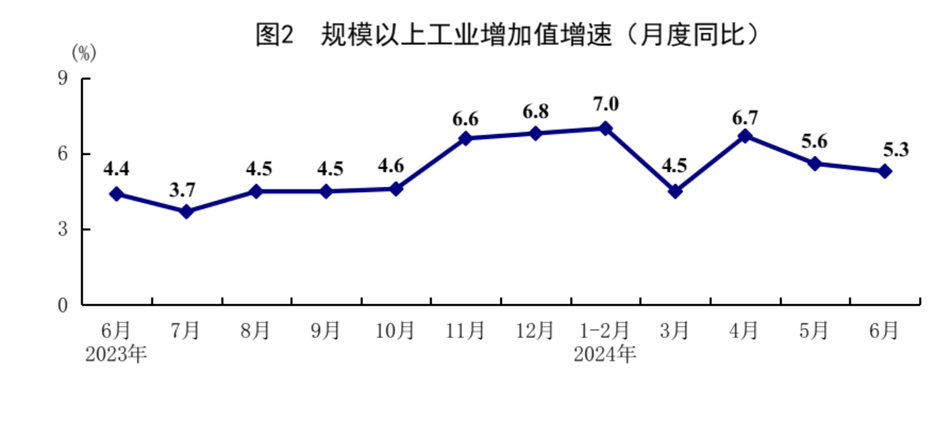 上半年,全国规模以上工业增加值同比增长6.0%。分三大门类看,采矿业增加值增长2.4%,制造业增长6.5%,电力、热力、燃气及水生产和供应业增长6.0%。装备制造业增加值增长7.8%,高技术制造业增加值增长8.7%,增速分别快于全部规模以上工业1.8和2.7个百分点。分经济类型看,国有控股企业增加值增长4.6%;股份制企业增长6.5%,外商及港澳台投资企业增长4.3%;私营企业增长5.7%。分产品看,3D打印设备、新能源汽车、集成电路产品产量同比分别增长51.6%、34.3%、28.9%。6月份,规模以上工业增加值同比增长5.3%,环比增长0.42%。6月份,制造业采购经理指数为49.5%,与上月持平;企业生产经营活动预期指数为54.4%,比上月上升0.1个百分点。1-5月份,全国规模以上工业企业实现利润总额27544亿元,同比增长3.4%。