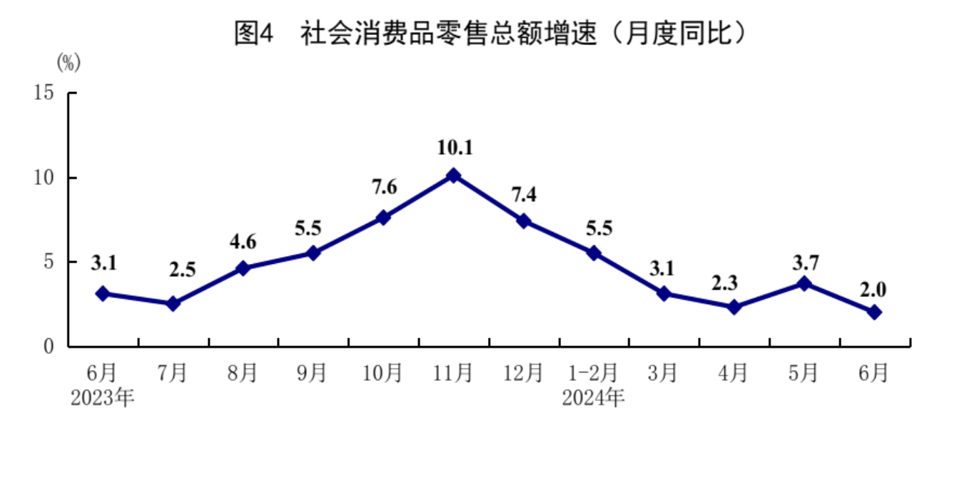 上半年,社会消费品零售总额235969亿元,同比增长3.7%。按经营单位所在地分,城镇消费品零售额204559亿元,增长3.6%;乡村消费品零售额31410亿元,增长4.5%。按消费类型分,商品零售209726亿元,增长3.2%;餐饮收入26243亿元,增长7.9%。部分基本生活类和升级类商品销售良好,限额以上单位粮油食品类、饮料类商品零售额分别增长9.6%、5.6%;通讯器材类、体育娱乐用品类商品零售额分别增长11.3%、11.2%。全国网上零售额70991亿元,同比增长9.8%。其中,实物商品网上零售额59596亿元,增长8.8%,占社会消费品零售总额的比重为25.3%。6月份,社会消费品零售总额同比增长2.0%,环比下降0.12%。上半年,服务零售额同比增长7.5%。