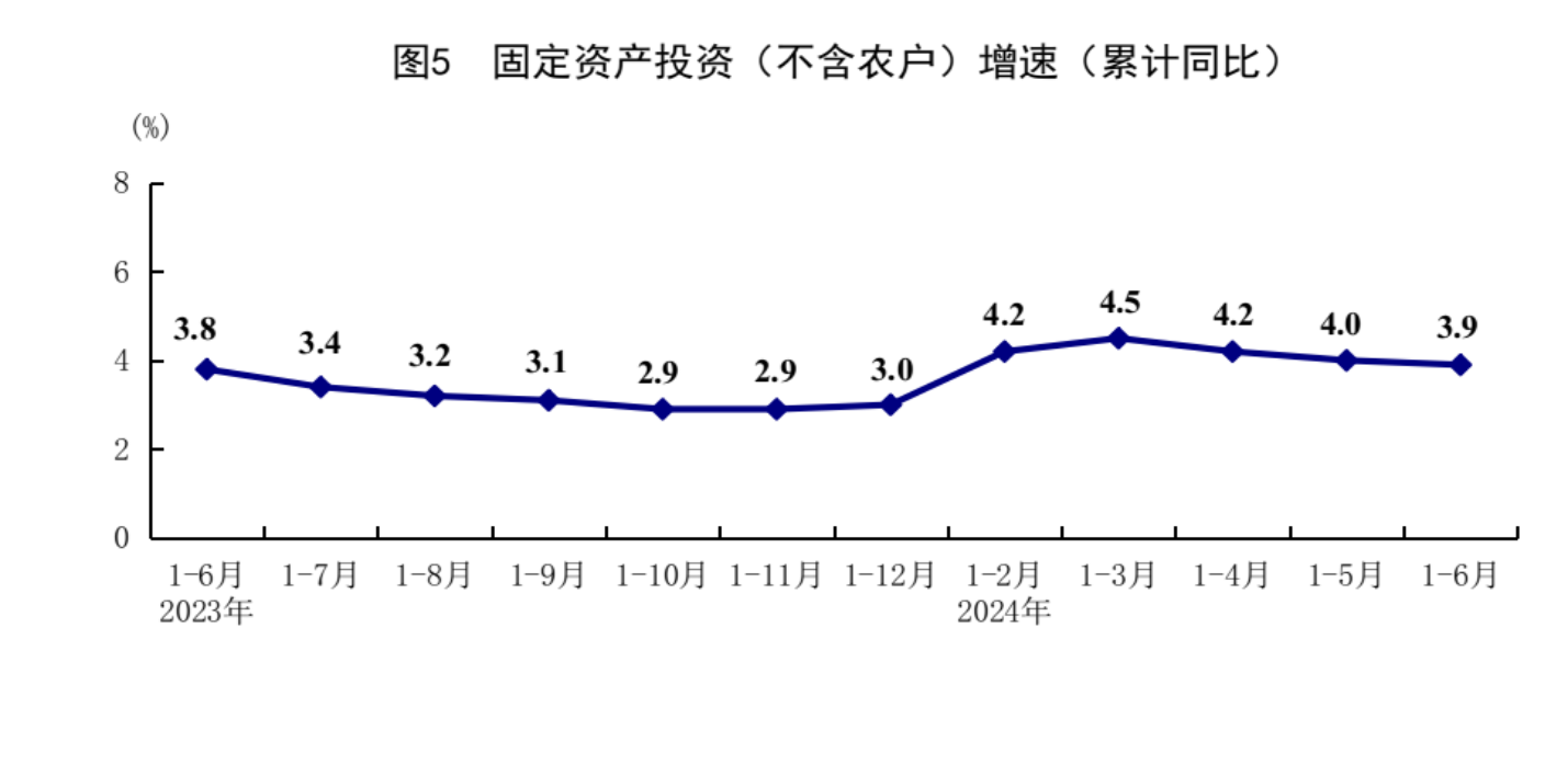 上半年,全国固定资产投资(不含农户)245391亿元,同比增长3.9%;扣除房地产开发投资,全国固定资产投资增长8.5%。分领域看,基础设施投资增长5.4%,制造业投资增长9.5%,房地产开发投资下降10.1%。全国新建商品房销售面积47916万平方米,同比下降19.0%;新建商品房销售额47133亿元,下降25.0%。分产业看,第一产业投资增长3.1%,第二产业投资增长12.6%,第三产业投资下降0.2%。民间投资增长0.1%;扣除房地产开发投资,民间投资增长6.6%。高技术产业投资同比增长10.6%,其中高技术制造业和高技术服务业投资分别增长10.1%、11.7%。高技术制造业中,航空、航天器及设备制造业,计算机及办公设备制造业投资分别增长38.3%、12.1%;高技术服务业中,电子商务服务业、科技成果转化服务业投资分别增长24.1%、17.4%。6月份,固定资产投资(不含农户)环比增长0.21%。