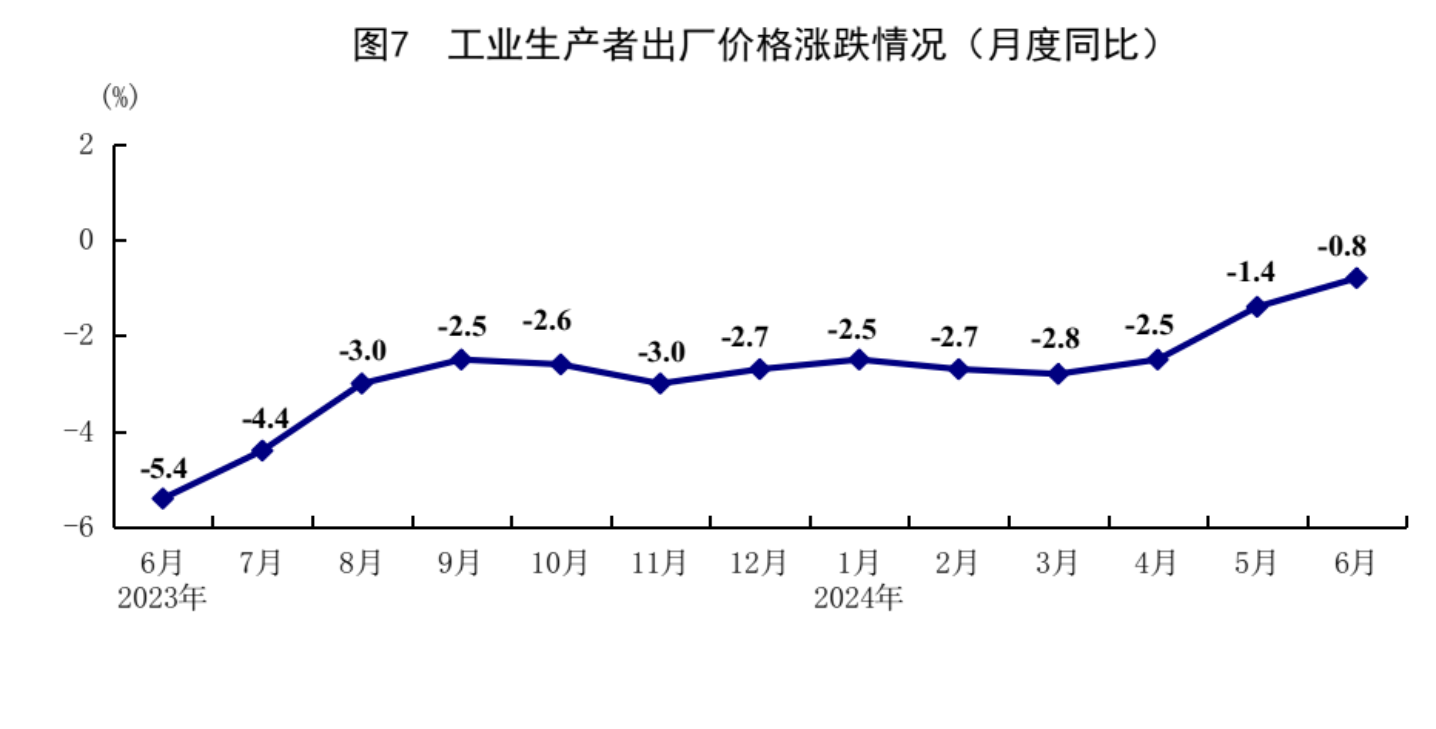 上半年,全国工业生产者出厂价格同比下降2.1%,降幅比一季度收窄0.6个百分点。其中,6月份同比下降0.8%,环比下降0.2%。上半年,工业生产者购进价格同比下降2.6%。其中,6月份同比下降0.5%,环比上涨0.1%。