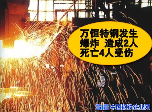 记者从兴化市政府得到消息证实,昨日早晨6:41,兴化市开发区万恒特钢有限公司发生中频炉爆炸事故。截至记者发稿前,已造成2人死亡、4人受伤。事故发生后,兴化市委市政府的相关领导以及开发区和市卫生、公安、消防、安监等部门都立即赶赴现场组织抢救事故受伤人员。目前受伤人员已得到有效救治,无生命危险。事故善后处理正在有序进行,事故原因正在进一步调查之中。